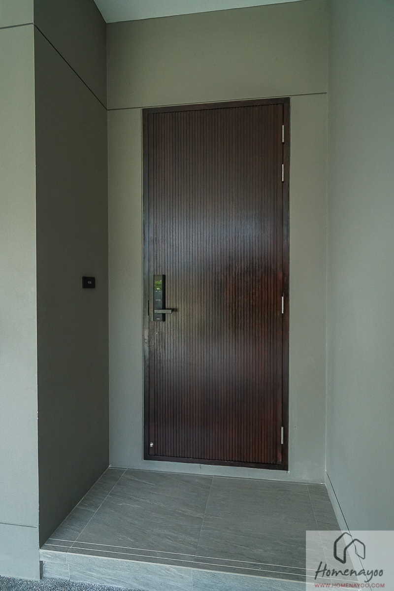 หน้าประตูบ้านมีเฉลียงในร่มขนาดใหญ่ มีทางเดินเชื่อมต่อมาจากที่จอดรถ ประตูบ้านบานไม้สัก ได้แบบบานเปิด 2 บาน แบ่งเป็นบานใหญ่ 1 บาน และบานเล็ก 1 บาน เปิดได้กว้าง