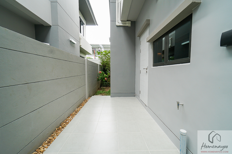 ในส่วนลานซักล้างจะปูพื้นกระเบื้องพร้อมติดตั้งปั๊มน้ำ แท็งก์น้ำมาให้เรียบร้อย โดยพื้นที่โซนหลังบ้านตรงนี้จะเป็นพื้นที่ของส่วน Maid Area ค่ะ คือจะมีห้องพักแม่บ้านพร้อมห้องน้ำในตัว ส่วนนี้จะมีทางเข้า-ออก แยกจากภายในบ้าน โดยส่วนของแม่บ้านจะอยู่ติดกับส่วนลานซักล้าง และครัวไทยให้แม่บ้านทำงานได้สะดวก