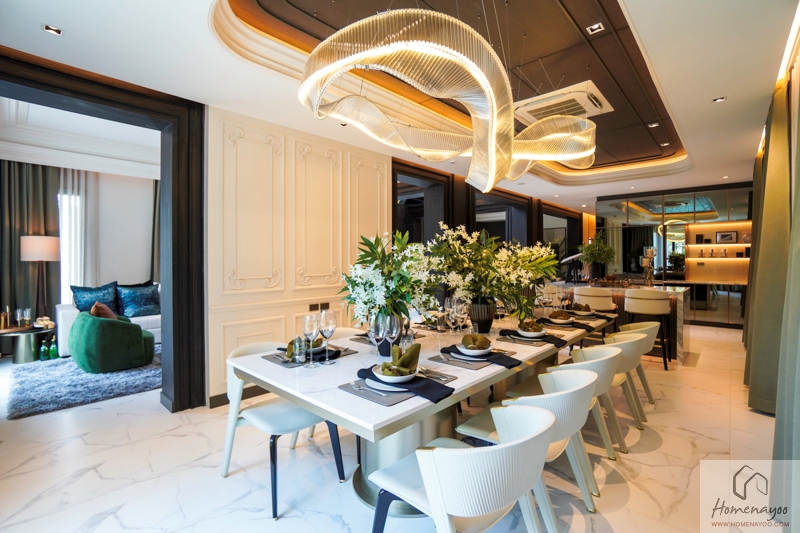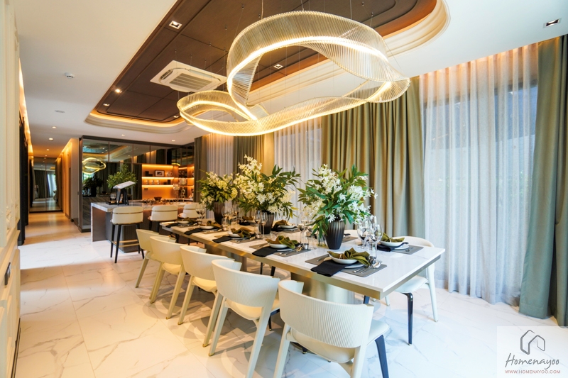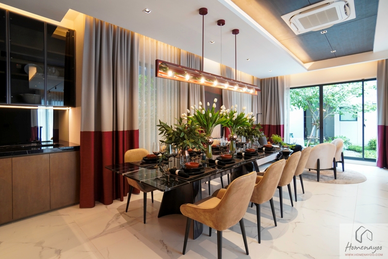 บ้านตัวอย่างตกแต่งฝั่งหลังบ้านทั้งหมดเป็นห้องรับประทานอาหารกับเคาน์เตอร์บาร์ขนาดใหญ่