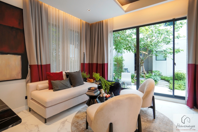 บรรยากาศภายในมีความโปร่งโล่งด้วยฝ้าเพดานสูงแบบ Double Volume ตกแต่งในโทนสีขาวครีมดูสะอาดตา และมีประตูหน้าต่างรับแสงธรรมชาติโดยรอบ มีการเตรียมมุมนั่งเล่นพักผ่อนไว้ให้หลายมุม