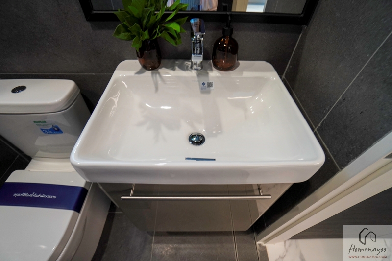 รุ่นของสุขภัณฑ์จะเหมือนกับห้องน้ำในห้องนอนชั้นล่างเลยค่ะ มีอ่างล้างมือฝังบนเคาน์เตอร์สำเร็จรูป