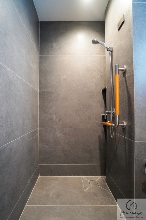 ด้านในมีห้องน้ำในตัว โดยเป็น Stepless Bathroom ไม่มีการลดระดับเลย ตกแต่งพื้นและผนังด้วยกระเบื้องลายหินโทนสีเทา แยกการใช้งานส่วนเปียก-ส่วนแห้ง พร้อมสุขภัณฑ์แบรนด์ Kohler ครบตามการใช้งาน และติดอุปกรณ์เสริมเพื่อการพยุงตัวค่ะ