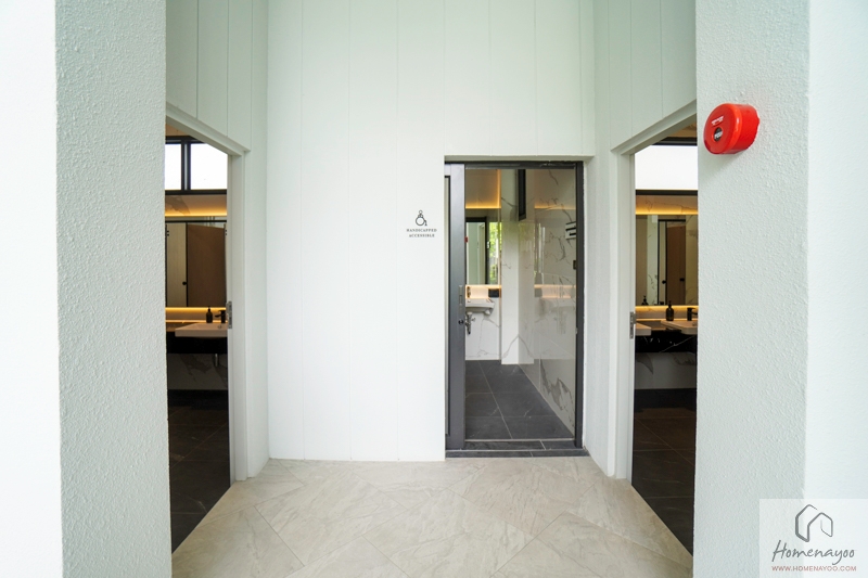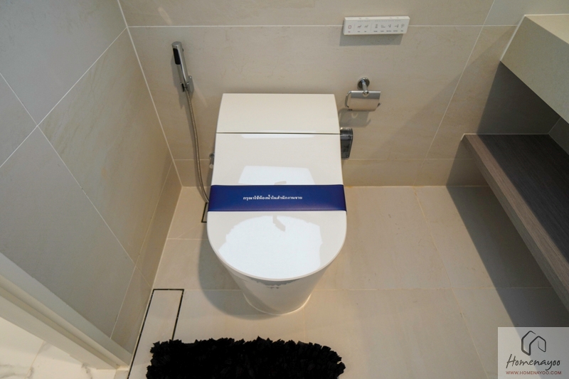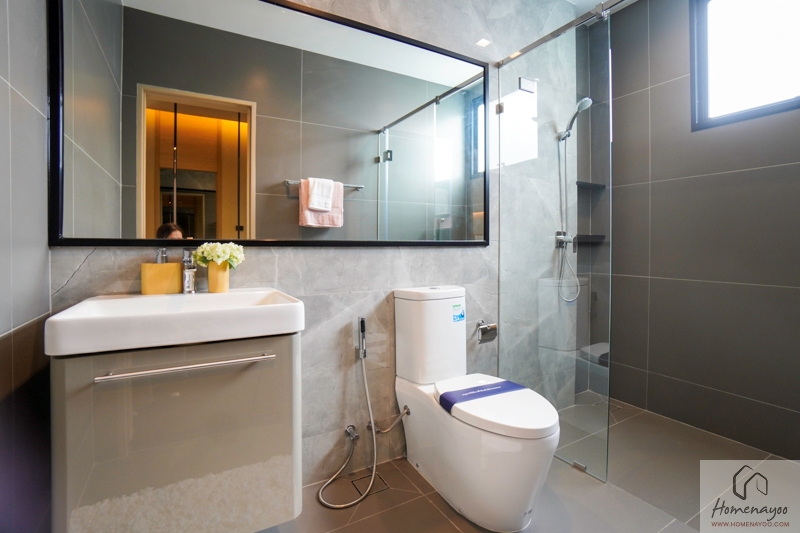 ซึ่งจะเป็นห้องน้ำแบบ Full Function มีขนาดใหญ่และมีการตกแต่งพื้นและผนังด้วยกระเบื้องลายหินสีเทาเข้ม ดูเรียบหรู ตัวสุขภัณฑ์อัปเกรดเป็นรุ่นพรีเมี่ยม