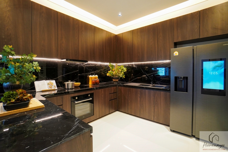 พื้นที่ห้องครัวไทยได้มาขนาดใหญ่ขึ้น การตกแต่งจะทำเคาน์เตอร์ L Shape ตัวใหญ่ได้ และยังสามารถเพิ่มมุมเตรียมอาหารและทานอาหารแบบง่าย ๆ เป็น Island ตรงการได้อีกด้วย ส่วนพื้นปูด้วยกระเบื้องแกรนิโตขนาด 60 x 60 ซม.