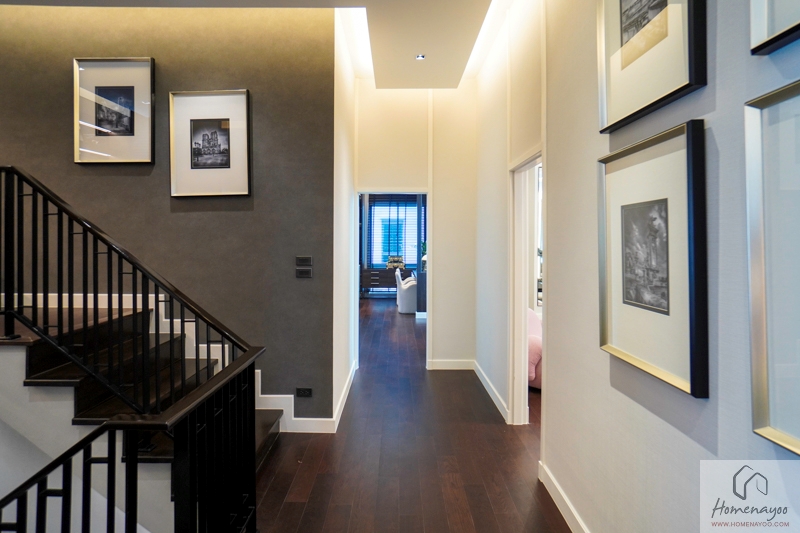 ฝั่งซ้ายมือเชื่อมไปยังห้องนอนชั้นล่าง ซึ่งจริง ๆ แล้วจะกั้นส่วนเป็นผนังทึบนะคะ แต่บ้านตัวอย่างทุบผนังออกทั้ง 2 ฝั่งแล้วเชื่อมต่อพื้นที่ให้กลายเป็นส่วนหนึ่งของ Living Space