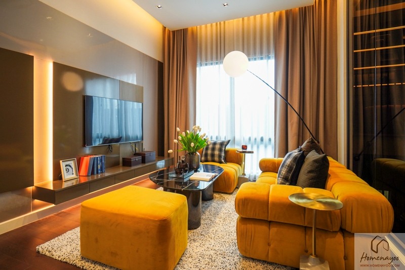 ส่วนบ้านตัวอย่างตกแต่งมาเป็นห้องพักผ่อนของครอบครัว ทำเป็นโซฟา U Shape ขนาดใหญ่