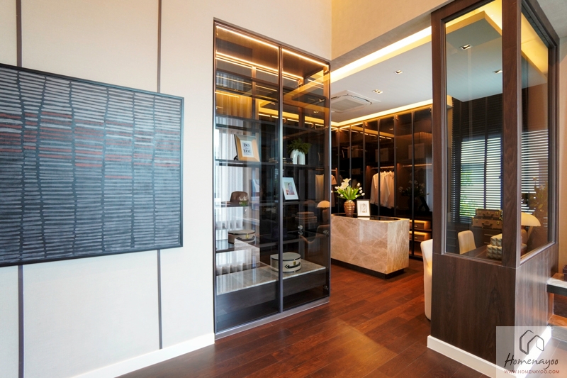 เราสามารถแบ่งกั้นส่วนพื้นที่ Walk-in Closet ได้เองตามต้องการ ที่บ้านตัวอย่างทำมาให้ดู คือทำ Built-in แบบ U Shape พร้อม Island ตรงกลางได้เลยค่ะ