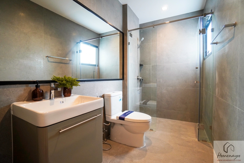ภายในห้องน้ำแบ่งส่วนเปียกส่วนแห้ง พื้นและผนังตกแต่งด้วยกระเบื้องลายหินโทนสีเทา ได้กระจกเงาบานใหญ่เต็มผนัง ห้องน้ำดูสว่างเนื่องจากมีช่องแสงขนาดใหญ่ และยังเป็นบานกระทุ้งให้เปิดระบายอากาศได้อีกด้วย