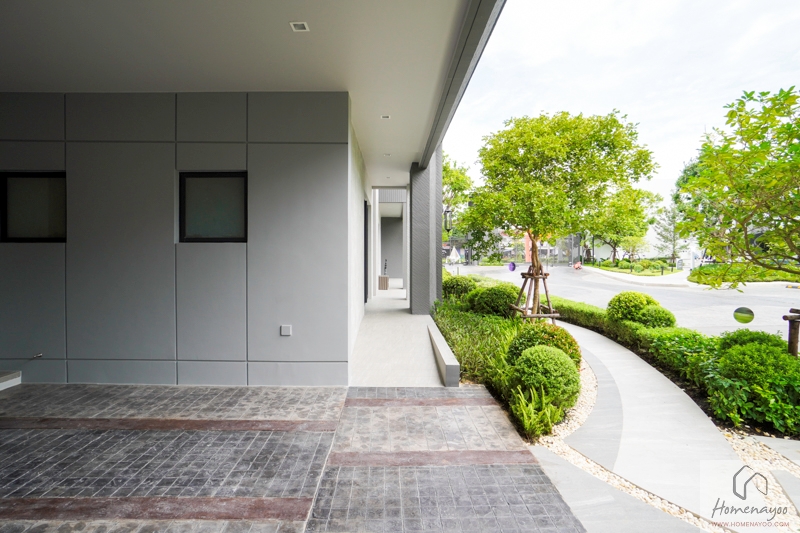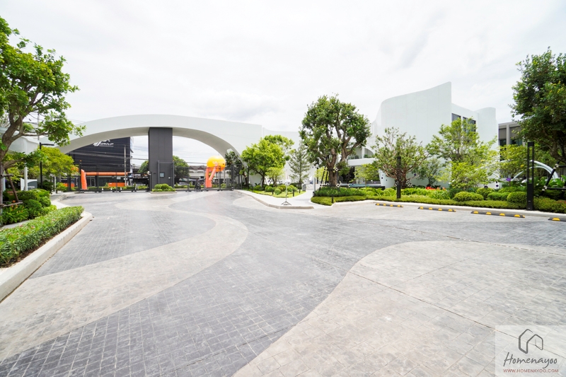 ผ่าน Main Gate เข้ามาภายในโครงการแล้ว เราจะเจอถนนหลักปูพื้นด้วย Stamped Concrete เป็นลวดลายเส้นโค้งตามคอนเซปต์ของโครงการ