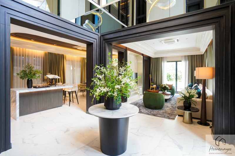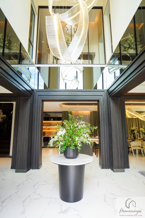เข้ามาในตัวบ้านส่วนแรกเป็น Foyer ดีไซน์เพดานสูงแบบ Double Volume ได้ฝ้าเพดานสูงถึง 6.85 ม. ต้อนรับเข้าบ้านด้วยความโอ่โถง พื้นปูกระเบื้องลายหินอ่อนสีขาวดูเรียบหรู