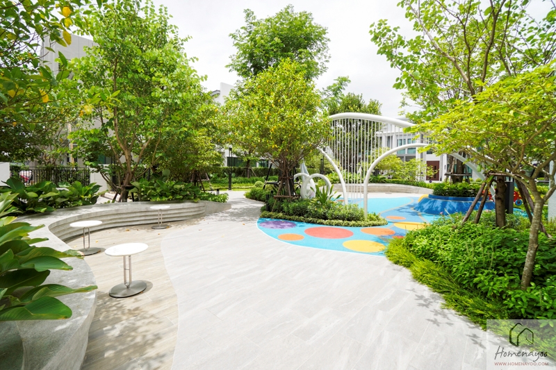 และมีมุมสนามเด็กเล่นอีกมุม พื้นสนามปูด้วยแผ่นยางกันกระแทก ดีไซน์เป็นสีสันฉูดฉาดสวยงามพร้อมชิงช้าและม้าโยกให้เด็กเล็กเล่นสนุกกัน นอกจากสวนส่วนนี้แล้ว ในอนาคตภายในโครงการยังมีสวนพักผ่อนกว่า 1.5 ไร่ จัดเอาไว้ให้ลูกบ้านได้เดินเล่นพักผ่อนกันในธรรมชาติอีก 1 สวนช่วงกลางที่ดินโครงการค่ะ
