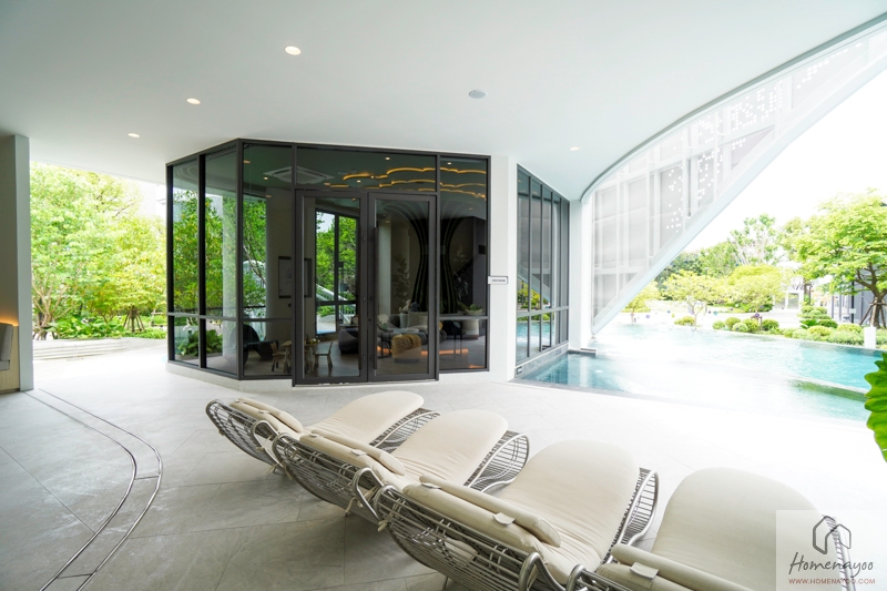 พื้นที่ด้านข้างสระออกแบบมาเป็น Pool Terrace พร้อม Sunbed สำหรับนอนพักผ่อนชมวิวในร่ม
