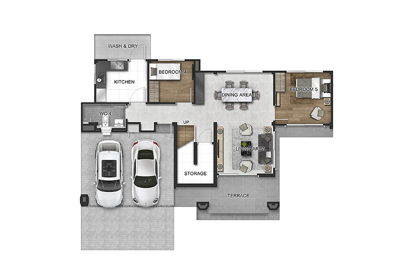 แปลนชั้น 1 พื้นที่บริเวณหน้าบ้านจะแบ่งเป็นที่จอดรถ 3 จอด จากที่จอดรถจะมีประตูทางเข้ารอง และมีทางเดินเชื่อมขึ้นมาที่ประตูทางเข้าหลักหน้าบ้าน และเฉลียงที่เชื่อมต่อเนื่องไปยังห้องนอน 5