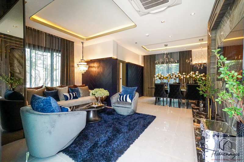 การออกแบบโครงการและวัสดุ : บ้านที่นี่ออกแบบมาให้รองรับครอบครัวขนาดใหญ่ สมาชิก 4-6 คนอยู่ได้สบาย ๆ พร้อมผู้สูงอายุ ตัวบ้านดีไซน์ Modern Luxury ที่ใช้กับโครงการนี้เป็นที่แรก เป็นบ้านหน้ากว้าง เน้นพื้นที่ใช้สอยในบ้าน