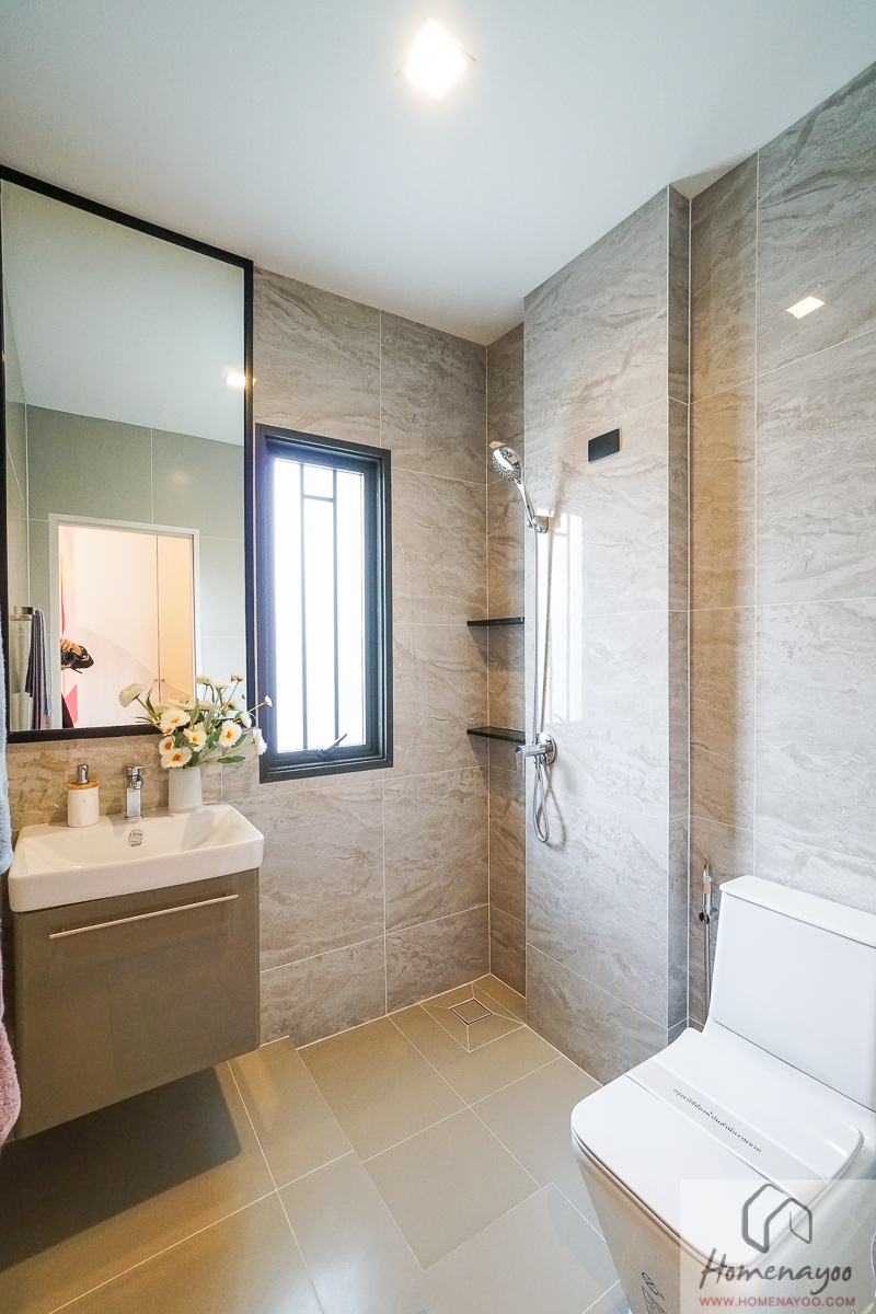 ภายในห้องน้ำตกแต่งออกมาได้แบบนี้เลยค่ะ ฟังก์ชันแยกโซนแห้ง โซนเปียก พร้อมหน้าต่างระบายอากาศติดตั้งมาให้เรียบร้อย