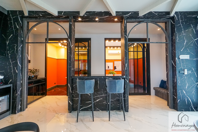 พื้นที่ส่วนด้านหน้าจัดวางเป็นห้องนั่งเล่นขนาดใหญ่ วางโซฟา พร้อมโต๊ะรับแขก และชุดเก้าอี้ด้านข้างได้โดยที่ยังมีระยะให้เราเดินผ่านไปมาได้สะดวกอยู่