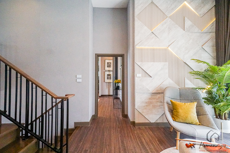 ขึ้นมาที่ชั้น 2 ความสูงฝ้า 3.4 ม. พื้นจะปู Spc ทั้งชั้นค่ะ ฟังก์ชันบนชั้นนี้จะเป็น 3 ห้องนอน พร้อมห้องน้ำในตัวทุกห้อง ส่วนแรกเป็นพื้นที่โถงกลางหรือ Family Area ที่เตรียมพื้นที่มาให้ค่อนข้างกว้างเลย วางชุดโซฟานั่งพักผ่อนได้ ทำเป็นห้องทำงานก็ได้