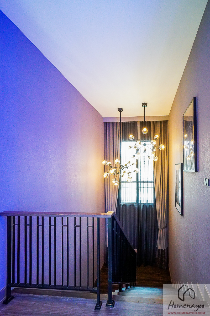 บันไดเป็นคอนกรีตเสริมเหล็ก เดินแน่นไม่มีเสียง พื้นบันไดเป็นไม้ Joint โถงบันไดสูง มีช่องแสงช่วยรับแสงธรรมชาติในช่วงเวลากลางวัน ด้านข้างโถงบันไดเป็นห้องเก็บของความสูงบานประตูมาตรฐาน เดินเข้า-ออก ได้สะดวก