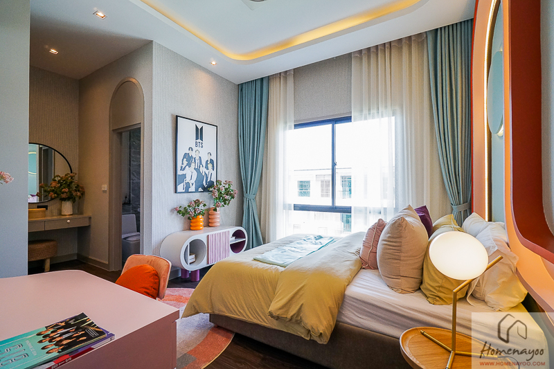พื้นที่ในห้องนอน บริเวณปลายเตียงมีแบ่งเป็นมุมห้องทำงานมาให้ดูเป็นตัวอย่างค่ะ ตรงนี้ใครอยากปรับเป็นมุมไว้ออกกำลังกายหรือเป็นห้อง Walk-in Closet ขนาดใหญ่ไปเลยก็ได้นะ