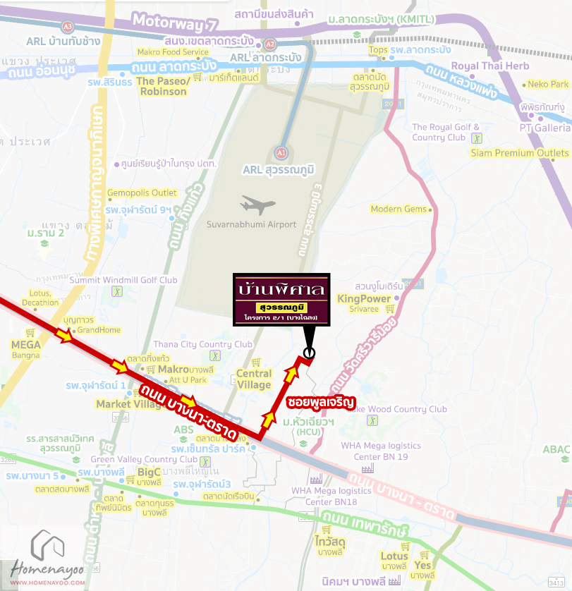 การเดินทาง ถ.บางนา-ตราด ⇒ ทางคู่ขนาน ถ.บางนา-ตราด ⇒ ซ.พูลเจริญ ขับตรงไปประมาณ 3.4 กม. ถึงโครงการบ้านพิศาล สุวรรณภูมิ 2/1 (บางโฉลง) *ใกล้ ม.หัวเฉียวฯ