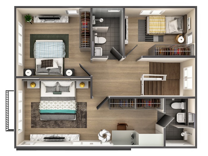 ตรงข้ามกันจะเป็นห้องนอนใหญ่ พร้อมห้องน้ำในตัว และ ห้องนอน 2 ทางฝั่งหลังบ้าน