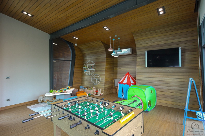 ปลายเตียงนอนตกแต่งผนังเป็นลายสนามฟุตบอล และ บิวท์อินชั้นวางทีวีแนวยาวมาให้ดูระยะใช้งาน ผนังห้องติดเต้าเสียบปลั๊กไฟ และ ช่องเสียบสาย Cable TV มาให้เรียบร้อย