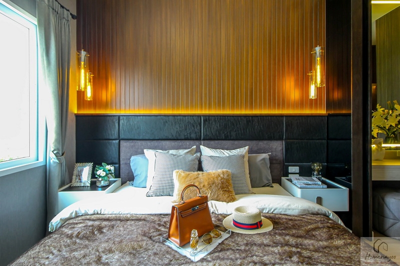 ในห้องนอนจะวางเตียง 6 ฟุต และ โต๊ะหัวเตียง 1 คู่ มาให้ดูระยะใช้งาน