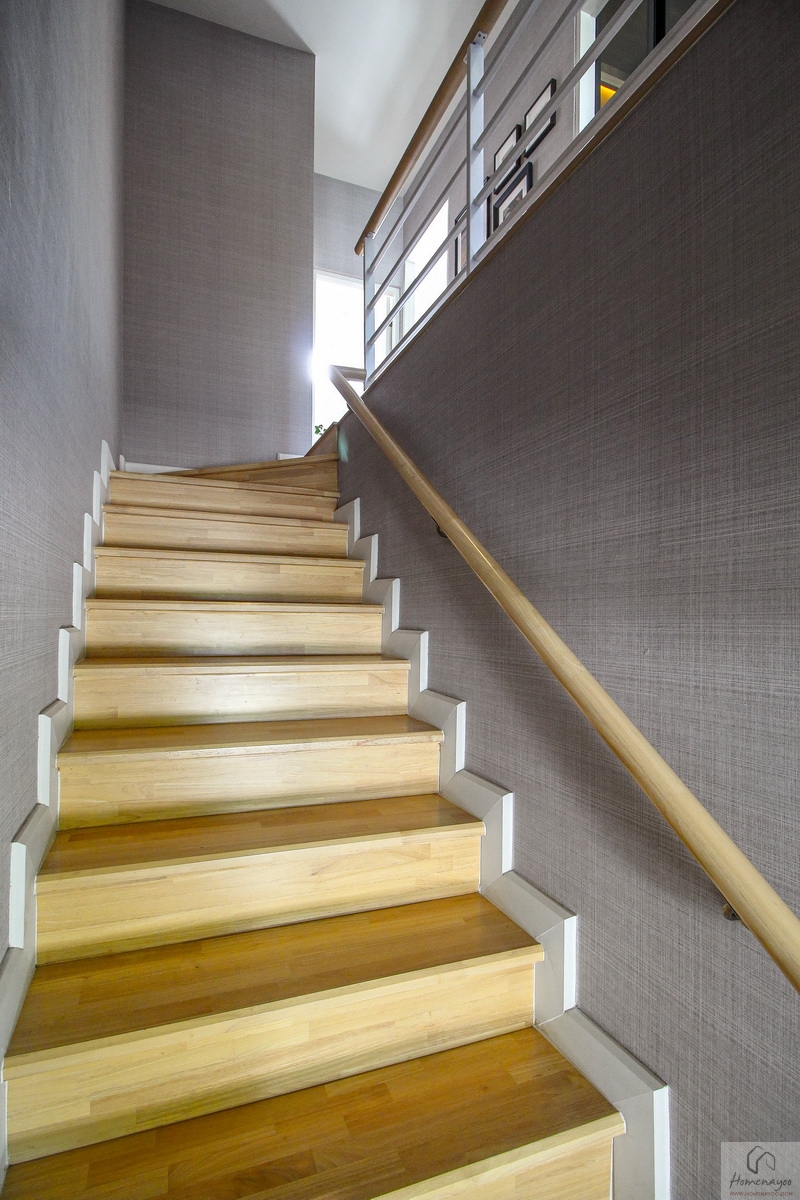 ขึ้นไปดูฟังก์ชันบ้านชั้น 2 กันต่อ โถงบันไดอยู่ตรงหน้าบ้าน ตัวบันไดโครงสร้างคอนกรีตเสริมเหล็ก แข็งแรง เดินขึ้น-ลงไม่มีเสียง ลูกตั้งและลูกนอนเป็นไม้อัดยางพาราสีอ่อน ราวบันไดแบบฝังผนัง และ ราวเหล็กสีขาวติดต่อเนื่องไปจนถึงชั้น 2