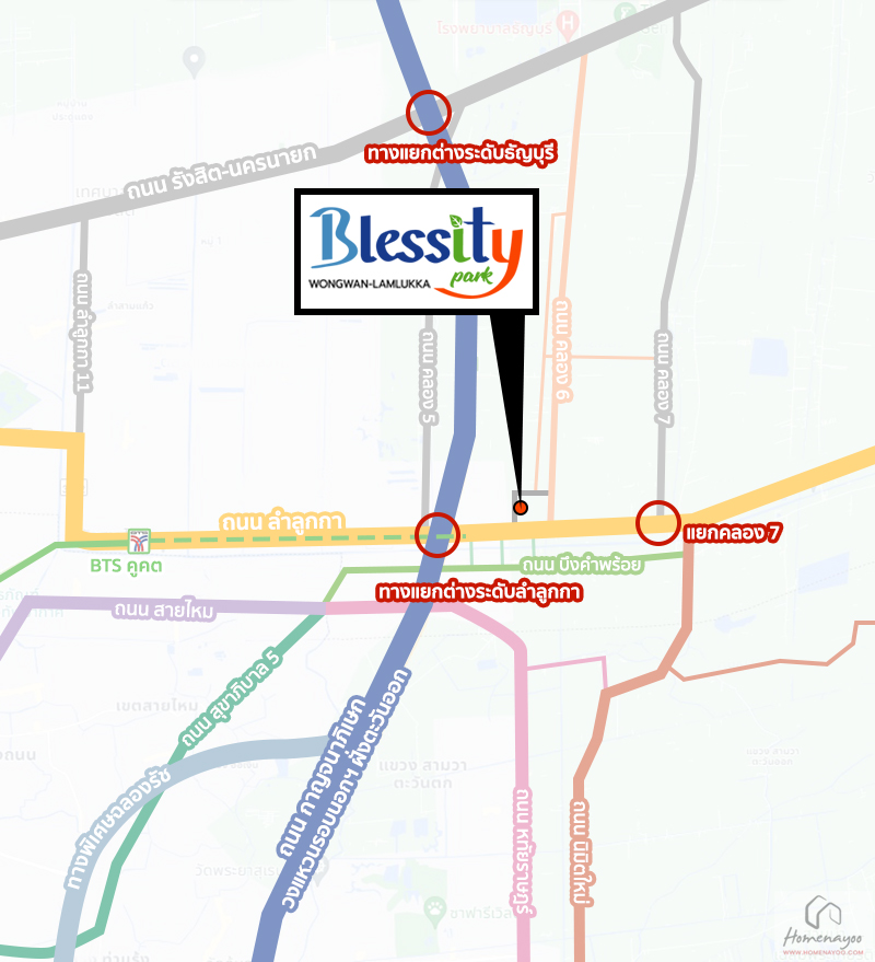 การเดินทางเริ่มจาก ถนนกาญจนาภิเษก ⇒ ทางออก 4 ลำลูกกา-พหลโยธิน ⇒ ถนนลำลูกกา ⇒ ซอยไปรษณีย์ลำลูกกา ขับตรงไปประมาณ 100 เมตร* ถึงโครงการ Blessity Park วงแหวน-ลำลูกกา *ใกล้ Home Pro ลำลูกกา คลอง 5