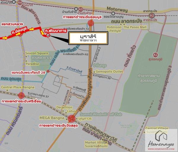 การเดินทางเริ่มจาก ถนนสุขุมวิท ⇒ ถนนอ่อนนุช ⇒ แยกสวนหลวง ⇒ ถนนพัฒนาการตัดใหม่ (ทางไปสวนหลวง ร.9) ⇒ ถึงโครงการ บุราสิริ พัฒนาการ