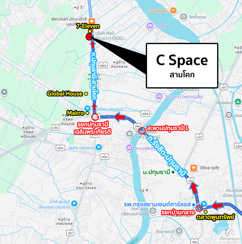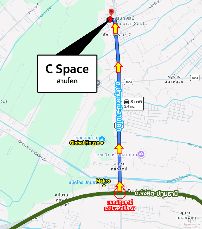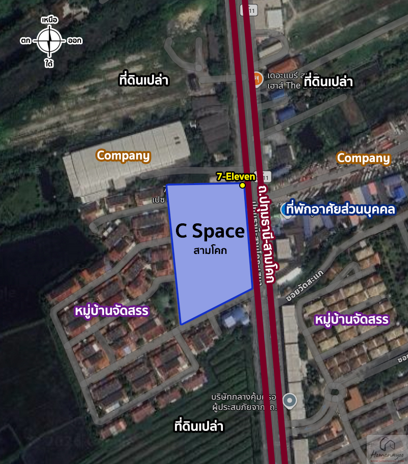 ถึงโครงการ ซี สเปซ สามโคก โดยที่ตั้งจะอยู่ติดถนนใหญ่ปทุมธานี-สามโคกเลยค่ะ ด้านหน้าทางเข้าจะมีร้านสะดวกซื้อ 7-Eleven เป็นจุดสังเกต