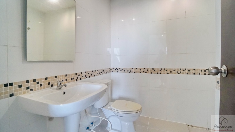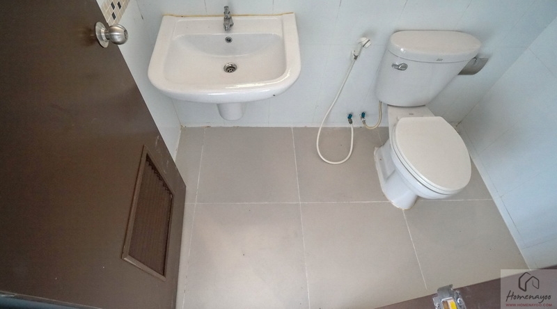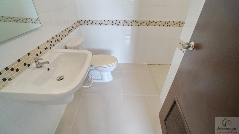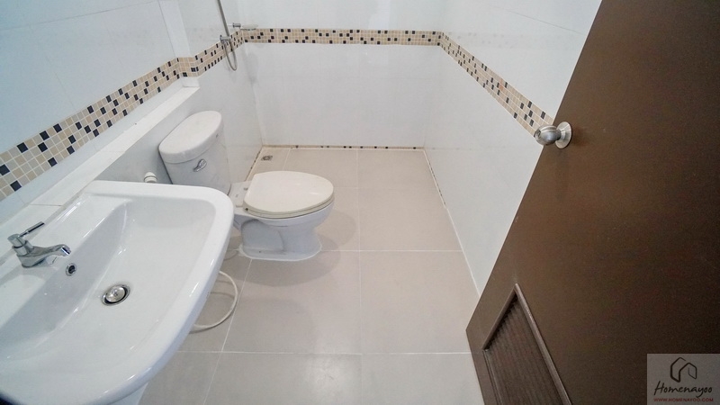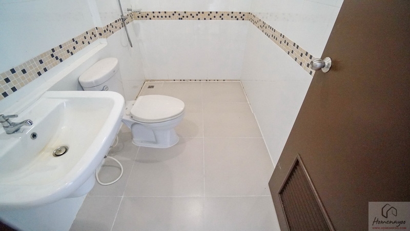 ขณะที่ห้องน้ำในตัวตกแต่งพื้นและผนังด้วยกระเบื้องโทนสีอ่อน แซมด้วยกระเบื้องโมเสคเพิ่มมิติในบางส่วนเช่นกัน แยกส่วนแห้ง-ส่วนเปียกด้วยการลดระดับพื้นลงเล็กน้อย สุขภัณฑ์มาตรฐานใช้ของ Victor, American Standard หรือเทียบเท่า ติดตั้งมาให้ตำแหน่งตามภาพ