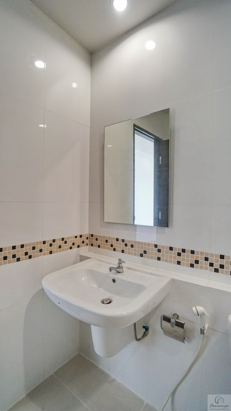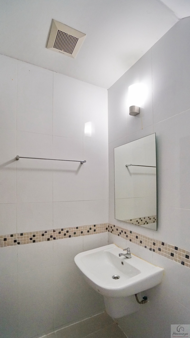 ฝ้าเพดานติดตั้งพัดลมช่วยระบายอากาศให้ 1 ตัว มุมอ่างล้างหน้าใช้ทรงเหลี่ยมขอบมนแบบแขวนผนัง คู่ก๊อกน้ำโครเมียมเปิด-ปิดใช้งานสะดวก หน้าอ่างมีที่เหลือให้วางของใช้หรือของตกแต่งได้อีกเล็กน้อย บนผนังติดกระจกเงาทรงสี่เหลี่ยมบานใหญ่ให้ 1 บาน พร้อมโคมไฟติดผนังทรงสวย ๆ ข้างกันมีราวแขวนผ้าเช็ดตัวหรือผ้าเช็ดมือให้ 1 ชิ้น