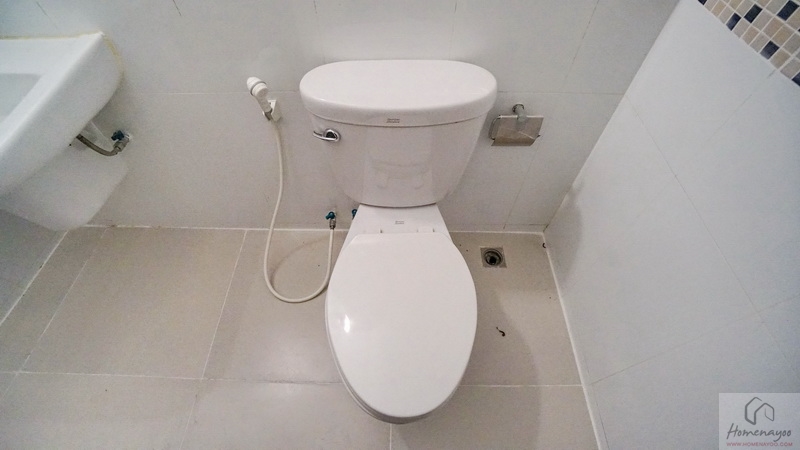 มุมโถสุขภัณฑ์แบบ 2 Piece ระบบ Single Flush ติดตั้งสายฉีดชำระและที่แขวนกระดาษทิชชูมาให้ครบชุด ระยะการนั่งใช้งานกว้างสบาย ๆ