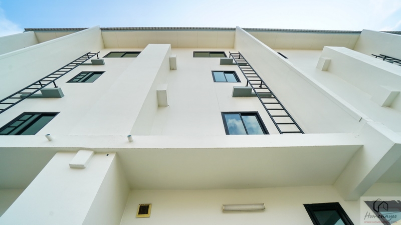 จากส่วนซักล้างมองแหงนขึ้นไปที่ตัวอาคารจะเจอมีผนังยื่นเป็นแผงแนวตั้งแบ่งช่องอาคารแต่ละยูนิต พร้อมคานแนวนอนยื่นออกมาทำหน้าที่เป็นกันสาดช่วยบังแดดบังฝน รวมถึงมีบันไดเหล็กสีดำแนวตั้งเชื่อมไปยังแต่ละชั้น สะดวกสำหรับงานซ่อมบำรุงต่าง ๆ หรือใช้เป็นทางหนีไฟหากเกิดเหตุฉุกเฉินก็ได้