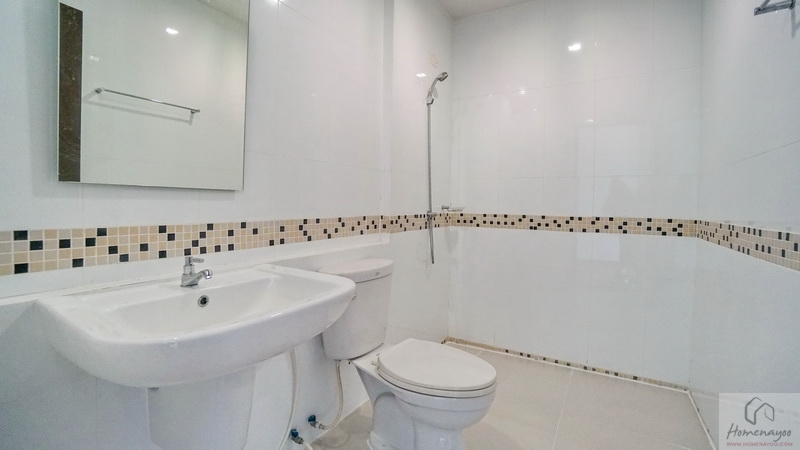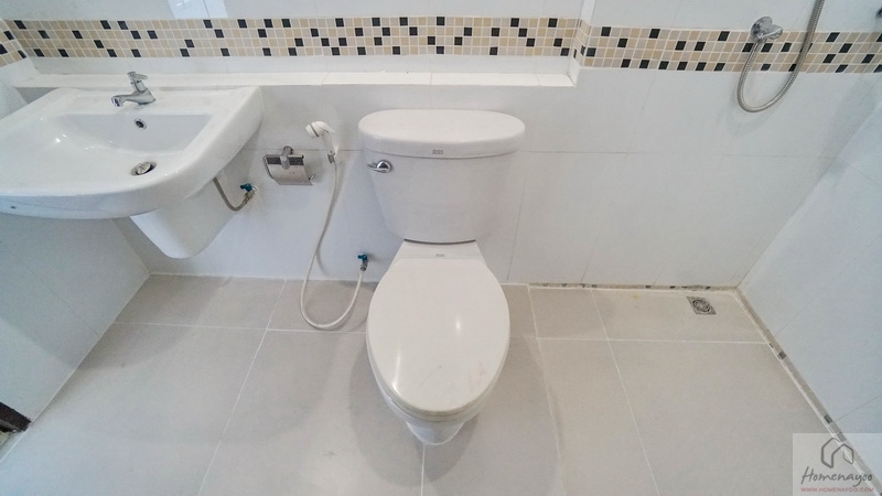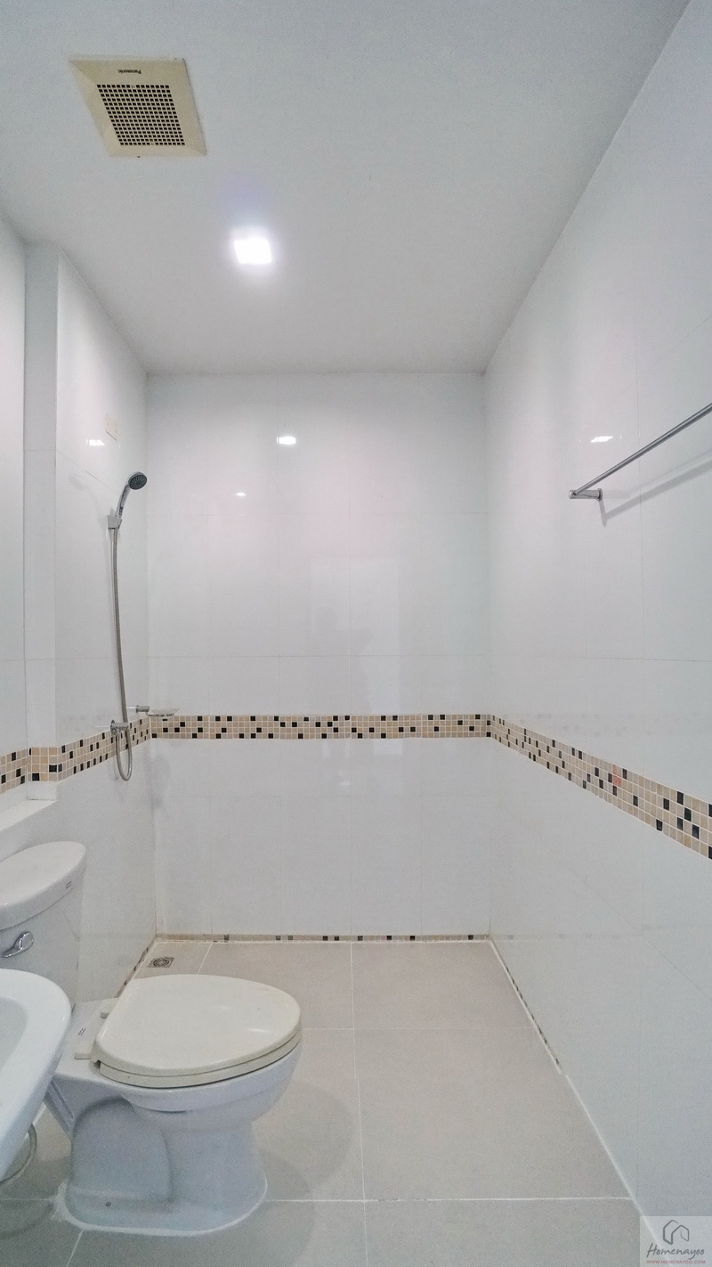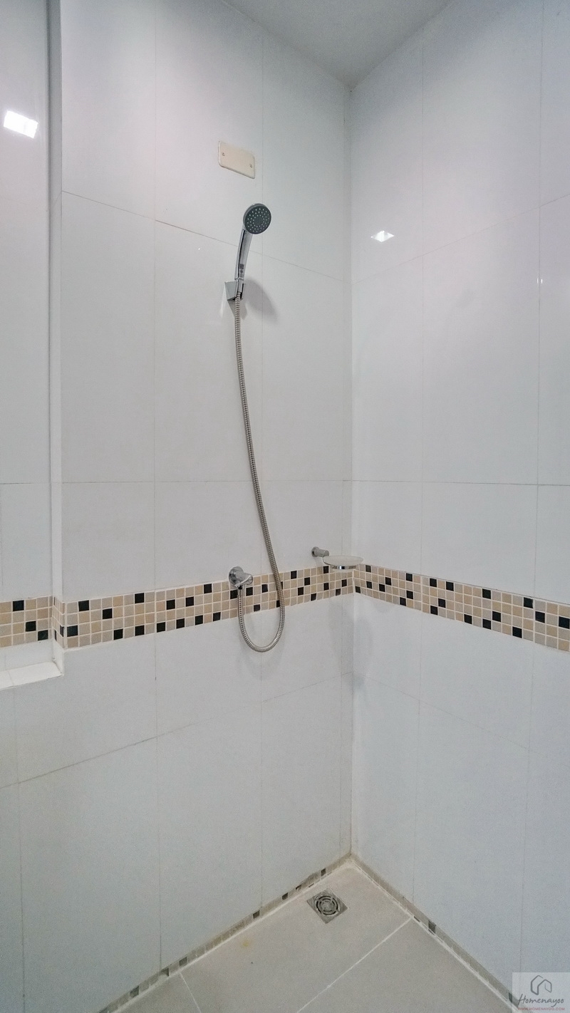 ใช้ฝักบัว Hand Shower คู่ก๊อกน้ำโครเมียมก้านโยก ใกล้กันติดชั้นวางสบู่ไว้ให้ 1 ชิ้น บนผนังเดินงานระบบไฟฟ้ามี Junction Box รองรับการติดตั้งเครื่องทำน้ำอุ่นได้อย่างปลอดภัย