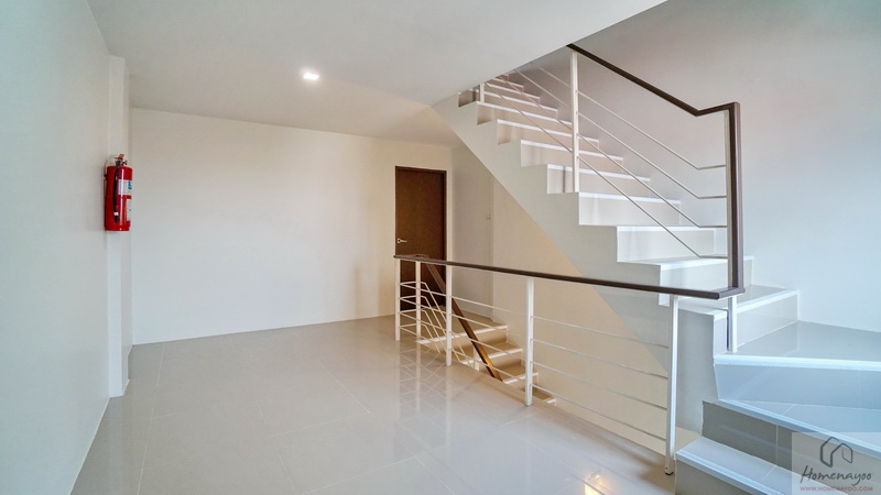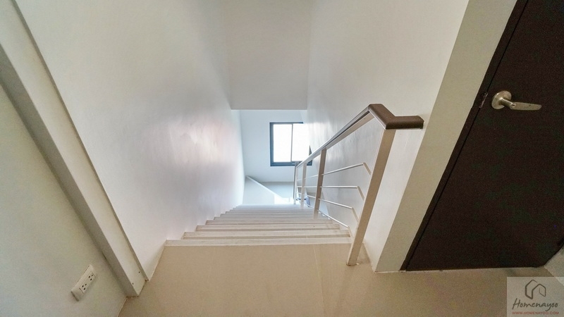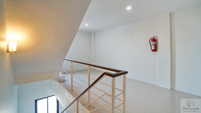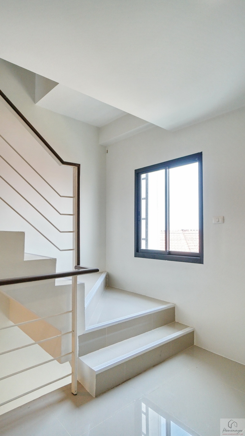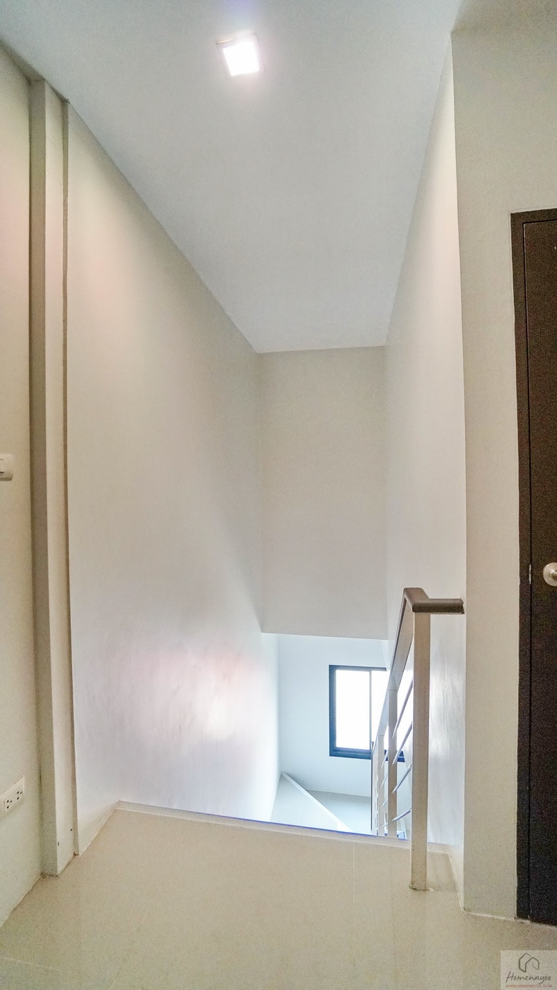 เราขึ้นไปดูชั้น 2 ของตัวอาคารกันบ้าง มีราวจับบันไดแบบฝังพื้นยาวต่อเนื่องไปจนถึงชั้นบน พร้อมราวกันตกเป็นโครงเหล็กทาสีขาวแบบในรูป ติดจมูกบันไดกันลื่นป้องกันการสะดุดหกล้ม เพิ่มรายละเอียดบันไดดูสวยงามสมบูรณ์ให้เรียบร้อย บริเวณนี้มีช่องแสงขนาดกะทัดรัดมาให้ 1 บาน