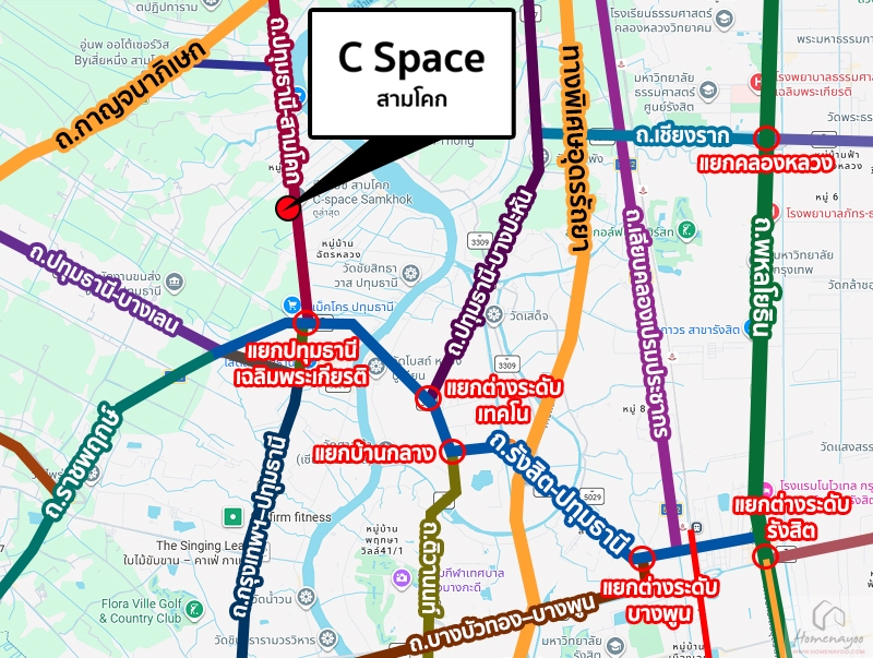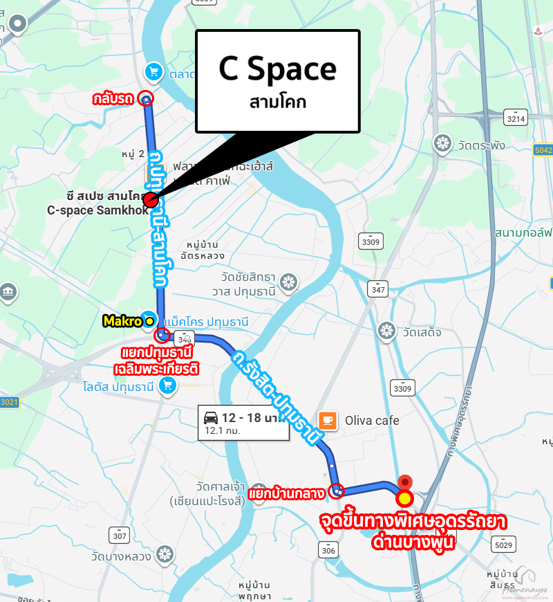การเดินทางเริ่มจาก ถนนรังสิต-ปทุมธานี (ช่วงแยกบ้านกลาง) ⇒ สะพานปทุมธานี 1 ⇒ แยกปทุมธานีเฉลิมพระเกียรติ ⇒ ถนนปทุมธานี-สามโคก ⇒ ซี สเปซ สามโคก