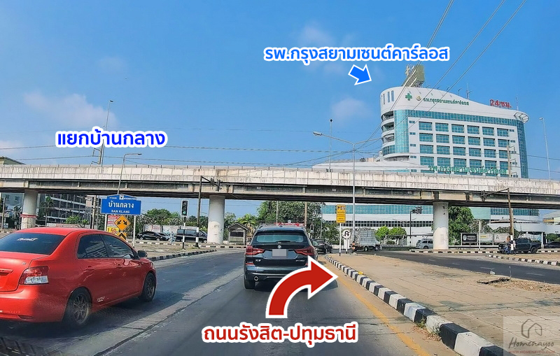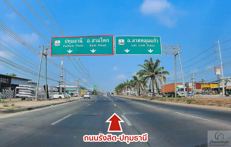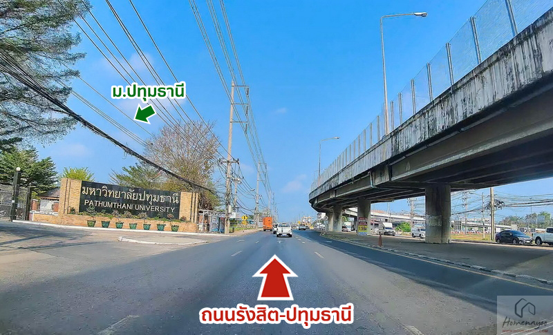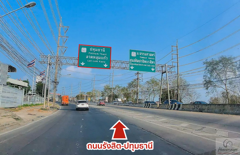 ฝั่งซ้ายเป็นทางที่เราใช้เดินทางมาสู่โครงการเมื่อสักครู่นี้จากแยกปทุมธานีเฉลิมพระเกียรติ (เดิมชื่อแยกสันติสุข) เชื่อมต่อถนนรังสิต-ปทุมธานี