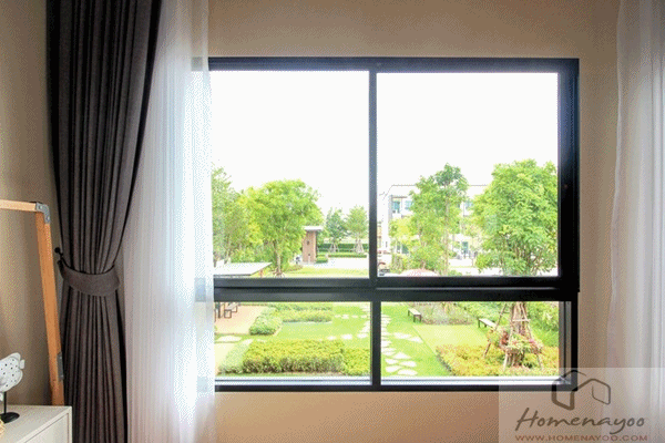 หน้าต่างช่องแสงบานเลื่อนเปิดคู่ มีลูกฟักบาน Fix ด้านล่าง รับแสงธรรมชาติได้เยอะและเปิดมุมชมวิวได้กว้าง