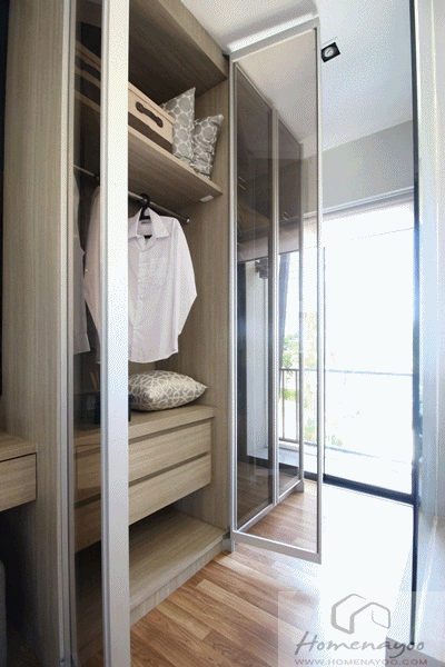 ซึ่งสามารถวางตู้เสื้อผ้าแบบเต็มๆแนวได้แบบนี้เลย แต่อาจจะชนกับประตูบานเลื่อนสักหน่อย แต่ไม่เป็นไรค่ะ เนื่องจากเวลาเปิดประตูออกระเบียงด้านนอกก็เลื่อนเปิดฝั่งเดียวอยู่แล้ว เว้นช่องสำหรับทำความสะอาดหน่อยละกัน
