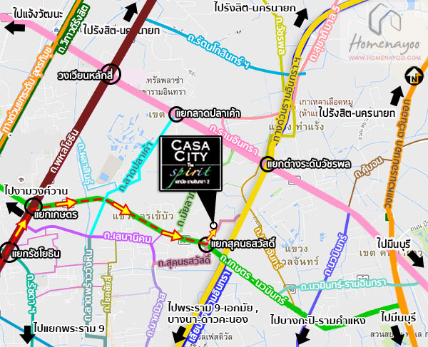 การเดินทางเริ่มจากแยกเกษตร ⇒ถนนเกษตร-นวมินทร์⇒แยกสุคนธสวัสดิ์⇒ถนนสุคนธสวัสดิ์⇒650 ม.⇒คาซ่า ซิตี้ เดอะ สปิริต เอกมัย-รามอินทรา 2 *ตรงข้ามร.ร.โชคชัย