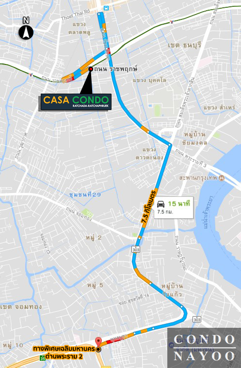 • จากโครงการไปทางพิเศษศรีรัช ด่านสุรวงศ์ ระยะทาง 7.5 กิโลเมตร ใช้เวลาประมาณ 19 นาที