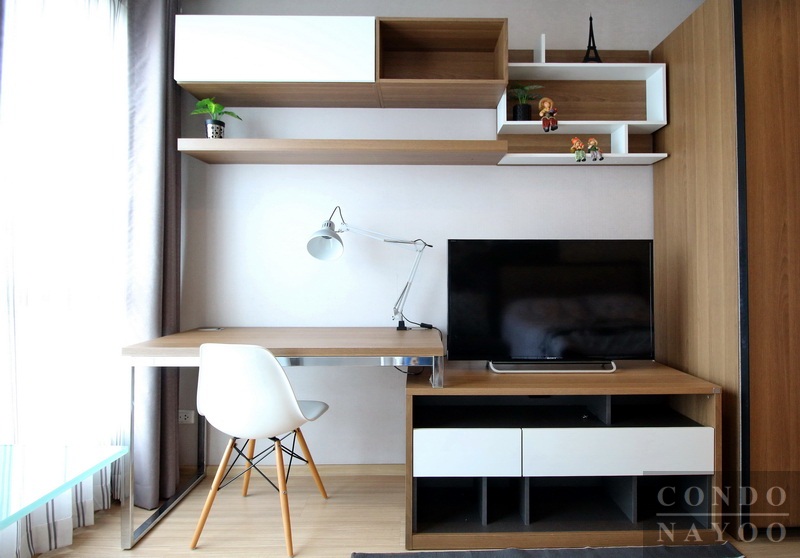 มาดูการจัดวางเฟอร์นิเจอร์กัน โต๊ะทำงานจะต่อติดกับตู้วางทีวีเลยค่ะ ความกว้าง ประมาณ 1.2 เมตร มีเก้าอี้นั่งทำงานให้ 1 ตัว ผนังด้านบนบิวท์อินชั้นวางของ + ตู้เก็บของเอาไว้ให้ สามารถวางพวกหนังสือ, กรอบรูป, ของตกแต่งบ้าน หรือ ของใช้เบ็ดเตล็ดได้ตามสะดวกเลย
