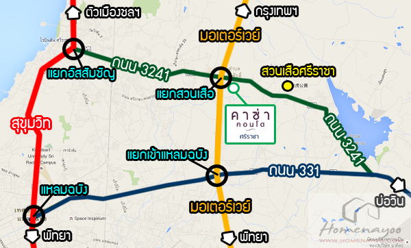 โครงการ Casa Condo ศรีราชา ตั้งอยู่ในอำเภอศรีราชา จังหวัดชลบุรี เดินทางจากกรุงเทพใช้เวลาประมาณ 1 ชม. ในกรณีที่ใช้ทางหลวงหมายเลข 7 กรุงเทพ-ชลบุรี (มอเตอร์เวย์) โดยเข้าทางเดียวกับสวนเสือศรีราชา โดยมีภาพประกอบการเดินทางดังนี้ครับ