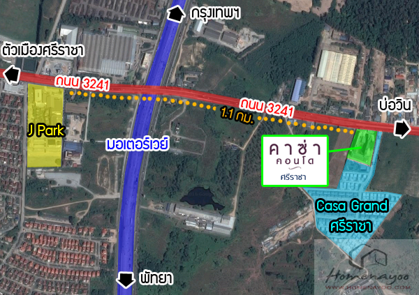 ทำเลที่ตั้งโครงการ – Casa Condo ศรีราชา ตั้งอยู่บนถนนหมาย 3241 หรือถนนสวนเสือศรีราชา ในตำแหน่งที่ใกล้กับทางเข้าออกถนนมอเตอร์เวย์ ทำเลดังกล่าวเป็นทำเลใกล้แหล่งอุตสาหกรรมปิ่นทองที่มีโรงงานจากประเทศญี่ปุ่นอยู่หลายเจ้า ทำให้มีชาวญี่ปุ่นพักอาศัยและทำงานอยู่ในศรีราชามากพอสมควร เรื่องความอุดมสมบูรณ์มี J Park เป็นแหล่งช้อปปิ้งหลักด้วยระยะทางเพียง 1.1 กม. ภายในมีทั้งร้านอาหาร, ร้านค้าและซุปเปอร์มาร์เก็ต Max Valu ส่วนอีกจุดที่มีความอุดมสมบูรณ์คือตัวเมืองศรีราชาบนถนนสุขุมวิทประกอบด้วยห้างโรบินสัน, ตลาดสดศรีราชา โรงเรียนอัสสัมชัญและโรงพยาบาลชั้นนำ