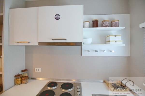 เคาน์เตอร์ท๊อปเมลามีนด้านล่างเว้นช่องสำหรับวางเครื่องซักผ้าแบบฝาหน้าและเครื่องไมโครเวฟ
