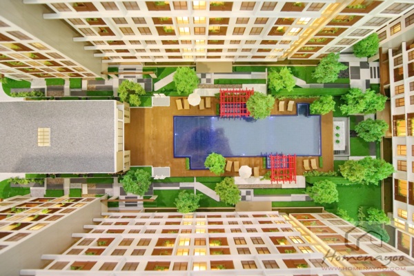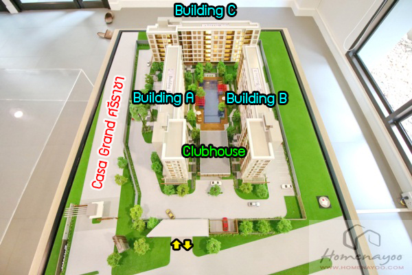 ภาพมุมสูงโมเดล ผ่านซุ้มประตูเข้าไปเจอกับอาคารพักอาศัย A อยู่ทางซ้าย และอาคาร B อยู่ทางขวา คั่นกลางด้วยอาคาร Clubhouse และสระว่ายน้ำอยู่ตรงกลาง ด้านในสุดเป็นอาคาร C
