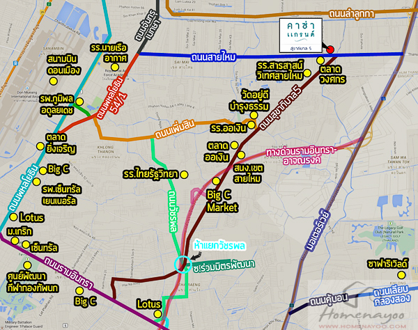 ทำเลโดยรอบ คาซ่าแกรนด์ สุขาภิบาล 5 ตั้งอยู่ในย่านชานเมือง ตัวโครงการจริงๆอยู่ติดกับถนนสายไหม แต่ใกล้กับจุดตัดระหว่างเส้นสุขาภิบาล 5 และสายไหม ห่างจากแยกประมาณ 100 ม. ย่านนี้มีความคึกคักในตัวพอสมควร ตัวโครงการอยู่ห่างจากตลาดวงศกรประมาณ 80 ม. ซึ่งเป็นตลาดศูนย์รวมที่สำคัญของย่านนี้เลย คือมีตั้งแต่ของกิน ของใช้ ร้านยา ร้านอาหาร ตลาดสด ตลาดนัด 7-11 ก็มี ฯลฯ รวมไปถึงริมสองฝั่งทางถนนสายไหม และสุขาภิบาล 5 ที่มีร้านอาหารให้เห็นเป็นระยะๆครับ ส่วนห้างสรรพสินค้าใกล้มี Big C Market หรือไปแถวเส้นพหลโยธิน รามอินทรา มี Lotus BigC เซ็นทรัลครับ