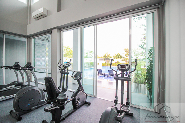 เดินเข้ามาก็จะเจอฟิตเนส ซ้ายมือเป็นประตูออกไปยังห้องน้ำ และสระว่ายน้ำด้านนอก